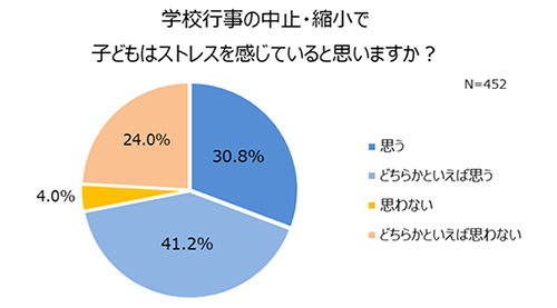 学校行事の中止・縮小によって、子どもがストレスを感じていると思うかを尋ねた質問では、「思う」(30.8%)「どちらかといえば思う」(41.2%)を合わせた割合が、72.0%に達した。