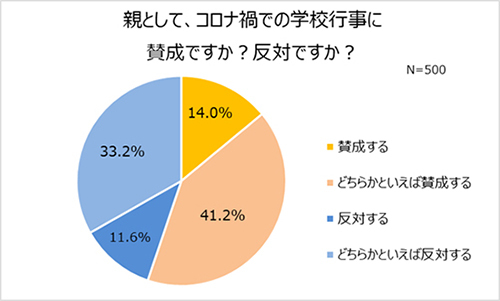 新型コロナ禍での学校行事の実施に対する賛否を尋ねたところ、「賛成する」「どちらかといえば賛成する」を合わせた割合は55.2%、「反対する」「どちらかといえば反対する」を合わせた回答は44.8%と、賛成派がやや上回る結果となっている。