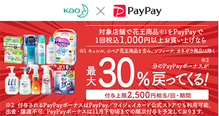 PayPayは、6月1日に花王とコラボした「花王商品の購入で最大30%戻ってくるキャンペーン」と「松屋フーズ創業55周年記念 松屋・松弁ネットで当たる!ペイペイジャンボ」をスタートする。花王商品の購入で最大30%戻ってくるキャンペーンは、1000円以上の花王商品の購入で決済金額の30%を還元するというもので、還元上限が2500円相当/回・期間。期間は6月30日まで。