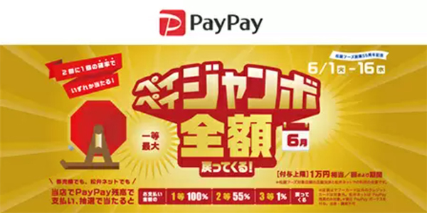 松屋フーズ創業55周年記念 松屋・松弁ネットで当たる!ペイペイジャンボは、PayPayを使い対象店舗で決済すると抽選で決済金額の最大全額が戻ってくるというもの。くじの内訳は、1等が100%、2等が55%、3等が1%。還元上限は、1万円相当/回・期間。対象となる店舗は、「松屋」「松のや」「松乃家」「マイカリー食堂」「ステーキ屋松」「松そば」「松弁ネット」(一部店舗は対象外)。期間は6月16日までとなる。