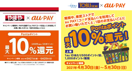 au PAYは、「東武ストア」での10%還元が5月30日に終了する。還元上限は、1au ID当たり500ポイント/回、1000ポイント/期間。もし、頻繁に利用している人は今週末での駆け込みをおすすめする。6月以降も10%還元を行っているのは「やまや」。還元上限は、1au ID当たり500ポイント/回、1000ポイント/期間となる。