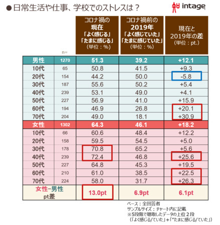 コロナ禍はとくに、自分のことが後回しになりがちな子育て世代女性や感染懸念が強い中高年女性で日常的なストレスの増加をもたらしている様子がうかがえる。