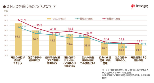 これらの上位5項目は、男性より女性の方がストレスを感じている人の割合が大きい。特に「外出や旅行が自由にできない」「自分や家族の感染リスク」「行動自粛で友人・知人との関わりが薄れている」で差が10ポイント以上と顕著だった。