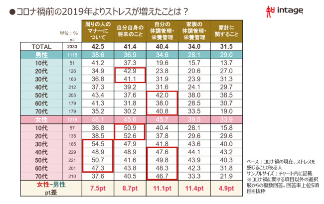 ストレス増のトップ3は「周りの人のマナー」「自分自身の将来」「自分の体調管理・栄養管理」でそれぞれ全体の4割以上。「周りの人のマナー」は、とくに女性の30代から60代で高く、ほぼ半数の回答率だった。「自分自身の将来」は、女性の10代・20代では過半数と若年での高さが目立つ。男性のなかでは20代・30代で高かった。「自分の体調管理・栄養管理」は、女性の40代以降でほぼ半数と、とくに高い。男性のなかでは50代以降で高かった。4位・5位の「家族の体調管理・栄養管理」「家計」はそれぞれ全体の3割超となった。