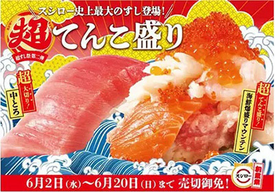 コンセプトは、「超てんこ盛り!」。同社史上最大の「超てんこ盛り!海鮮爆盛りマウンテン」と「超大切り!中とろ」はじめ、大切り、大盛り、てんこ盛り商品をラインアップしている。