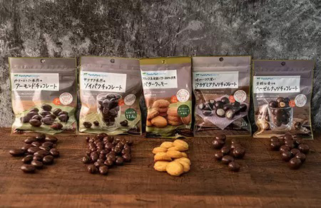 商品は、「カリッとした食感のアーモンドチョコレート」(価格は198円)、「サクサク食感のソイパフチョコレート」(同198円)、「フランス産発酵バター100%使用バタークッキー」(同138円)、「味わいコク深いマカダミアナッツチョコレート」(同198円)、「芳醇な香りのヘーゼルナッツチョコレート」(同198円)となる。