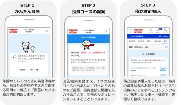 スマートフォン(スマホ)に特化し、九つの質問に答えるだけで、「のんびり」「じっくり」など、自動で最適な投資コースを提案し、設定金額に応じて自動的に新しく組成された「らくらく投資」専用の投資信託を買い付ける。