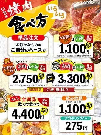 価格は、焼肉食べ放題コース(レーン上の肉&小鉢食べ放題+《期間限定》つぼ漬けカルビ1品付き)90分2750円をはじめ、焼肉食べ放題コース(肉全メニュー&小鉢食べ放題)90分が3300円、全商品飲み食べ放題120分が4400円、つぼ漬けカルビ1品&小鉢食べ放題60分が1100円となる。