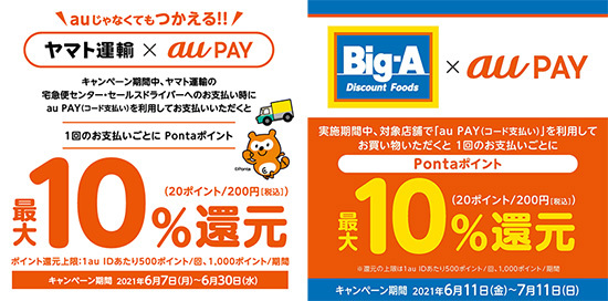 au PAYが現在お得なのは、「やまや」「ヤマト運輸」「ビッグ・エー」での10%還元。やまやの還元上限は、1au ID当たり500ポイント/回、1000ポイント/期間で、6月20日まで。ヤマト運輸の還元上限は、1au ID当たり500ポイント/回、1000ポイント/期間、6月30日まで。ビッグ・エーの還元上限は、1au ID当たり500ポイント/回、1000ポイント/期間、7月11日までとなる。