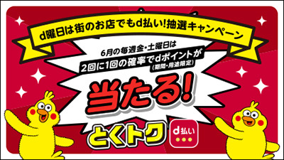 d払いは、月の毎週金・土曜日に対象加盟店でd払い(コード決済)を使って200円以上の買い物をすると、2回に1回の確率でdポイントが当たる「d曜日は街のお店でもd払い!抽選キャンペーン」を実施中。