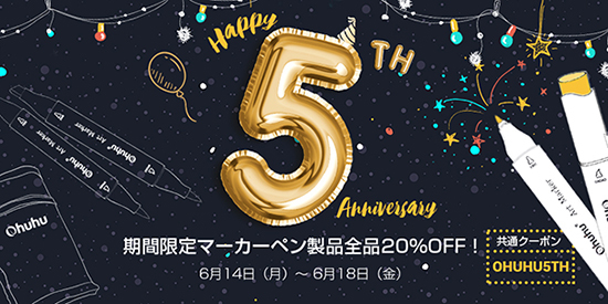 画材からアウトドア用品まで幅広い製品を取り扱うOhuhuは、日本上陸5周年を記念して、6月14~18日の期間、Amazon.co.jpで「Ohuhu5周年記念セール」を開催する。節目を迎える今年は、過去最多、全マーカーペン製品を対象に20%オフで提供する。