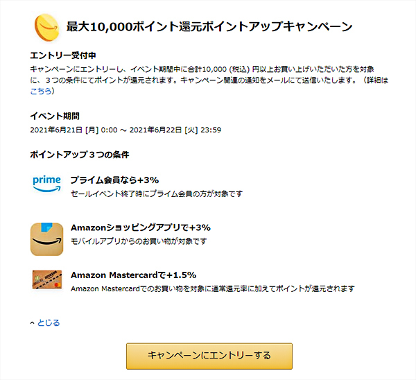 まず、押さえておきたいのが期間中に適用される「最大10,000ポイント還元ポイントアップキャンペーン」だ。プライムデーで1万円以上購入した人が対象で、三つの条件に応じてポイントが還元される。条件は、プライム会員であること(+3%)、Amazonショッピングアプリで買い物すること(+3%)、Amazon Mastercardで買い物すること(+1.5%)。すでにエントリーを受け付けているので、忘れないうちに登録を済ませておこう。