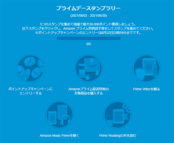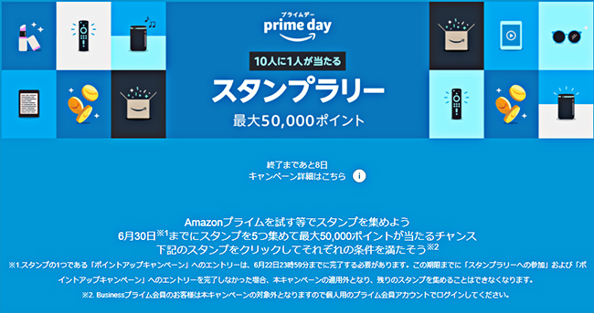スタンプの対象は、「ポイントアップキャンペーンにエントリーする」「Amazonプライム配送特典の対象商品を購入する」「Prime Videoを観る」「Amazon Music Primeを聴く」「Prime Readingの本を読む」。クリアが容易なものが多いので、ぜひ参加することを勧めたい。期間は6月30日までだが、ポイントアップキャンペーンへのエントリーは6月22日23時59分で終了なので、注意してほしい。