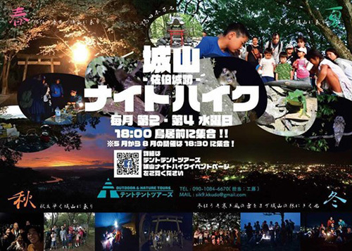 城山は、標高144mで山頂までの登山道は1kmにも満たない登りやすい山である。歩いて20分ほどで登れるので、地元の人は課外授業で一度は登った経験があるなど、とても慣れ親しまれている。日中いつ行っても人が居て挨拶し合うような、そんな温かい場所でもある。しかも、“大”を付けてもいいぐらいの自然が迎え入れてくれる。そんな大自然にもっと深く触れることができる「城山ナイトハイク」がある。