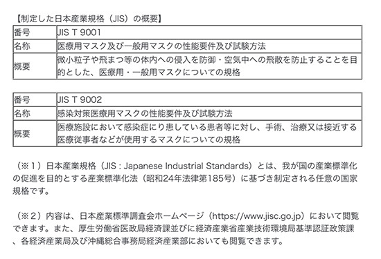 経済産業省と厚生労働省は6月16日、マスクに関する日本産業規格(JIS T 9001・JIS T 9002)を制定したと発表した。今後、JIS原案作成団体である日本衛生材料工業連合会が、関係する機関と連携して規格の適合性を審査し、適合したマスクには、同連合会が発行する認証番号などを表示できる仕組みを運用する予定。
