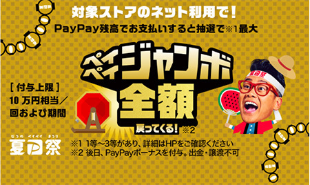 全PayPayユーザー必見となるのが、7月1日~25日に開催される「夏のPayPay祭」。期間中は、全国の加盟店、オンラインショップでPayPayを使って支払うと、PayPayボーナスが通常よりも多く付与される。特に「夏のPayPay祭 ペイペイジャンボ(オンライン)」は、抽選で決済金額の最大全額が戻ってくる。還元上限は10万円相当/回・期間と高いので、ぜひ狙ってみたい。