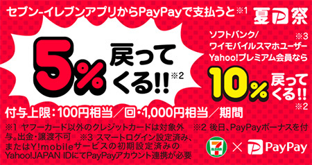 また、セブン-イレブンとコラボしたキャンペーンでは、セブン-イレブンアプリからPayPayを利用することで5%(ソフトバンク/ワイモバイルスマホユーザー/Yahoo!プレミアム会員は10%)が還元される。還元上限は100円相当/回、1000円相当/期間。このほかにもさまざまなキャンペーンが開催される予定なので、開始日までこまめに最新情報をチェックしよう。