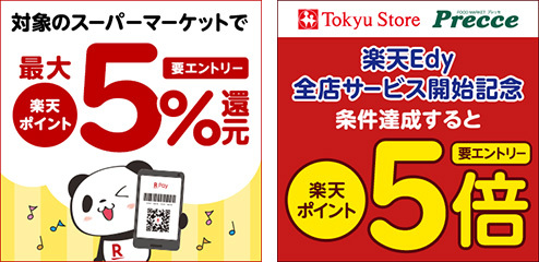 個別のキャンペーンも多い。まず、東急ストア・プレッセは楽天Edy導入を記念したキャンペーンを実施中。楽天ポイントカードを提示し、楽天Edyもしくは楽天ペイアプリで支払うと、5倍のポイントを獲得できる。特典ポイントの上限は2000ポイント、6月30日まで実施している。