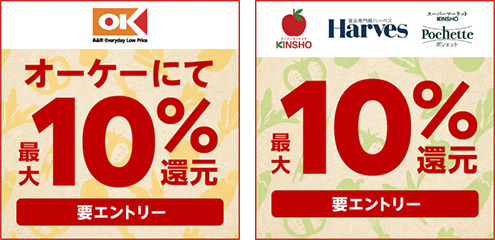 オーケー・近商ストア・Harves・Pochetteでも6月14日に最大10%還元キャンペーンがスタートしている。還元率は初めて楽天ペイを利用するユーザーが10%、すでに利用したことがあるユーザーが5%となっている。還元上限は500ポイント。期間は6月30日まで。