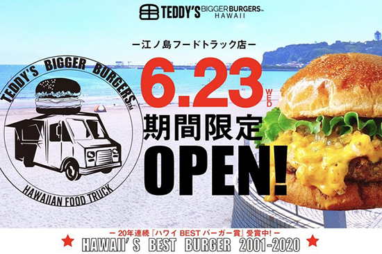 20年連続「ハワイBESTバーガー賞」を受賞しているハワイの世界一おいしいハンバーガー「TEDDY'S BIGGER BURGERS(テディーズビガーバーガー)」を食べることができる、江ノ島フードトラック店が江ノ島島内に6月23日から8月31日まで期間限定でオープンする。