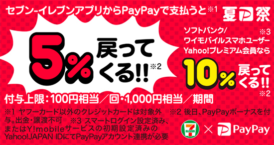 セブン-イレブンとコラボしたキャンペーンでは、セブン-イレブンアプリからPayPayを利用することで5%(ソフトバンク/ワイモバイルスマホユーザー/Yahoo!プレミアム会員は10%)を還元。還元上限は100円相当/回、1000円相当/期間。