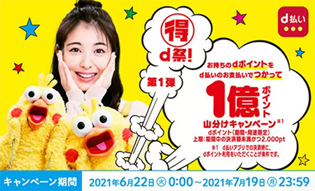d払いは、6月22日に「【マル得d祭!第1弾】お持ちのdポイントをd払いのお支払いでつかって1億ポイント山分けキャンペーン」が開始。2000ポイントを上限に1億分のdポイントを山分けでプレゼントするというもので、1ポイント以上、dポイントを利用したd払い(コード決済)とd払いアプリから利用できる「予約・注文」サービスが対象となる。