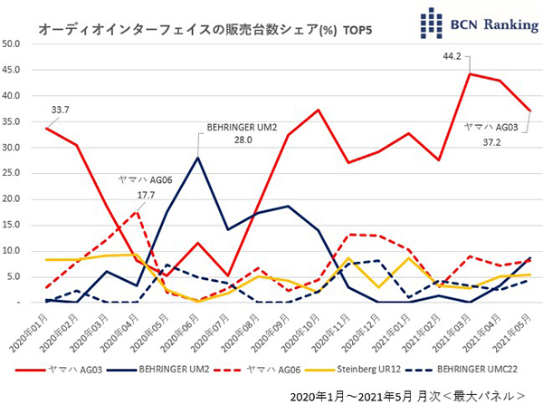 販売台数シェア2位のBEHRINGER UM2も似たような機能を持つ製品だが、フェーダーはない。上位機種のヤマハのAG06はシェア3位だが、2本のマイク入力に対応したことでフェーダーではなく一般的なつまみ式のボリュームになっている。4位のSteinberg UR12、5位のBEHRINGER UMC22のいずれもフェーダー非搭載の味気ない面持ちだ。一方、フェーダー搭載のAG03は、2018年5月~2021年5月までの3年の累計シェアでも25.0%と、ぶっちぎりのNo.1。人気の秘密は、はやり気分が上がるロマン仕様のフェーダーにあるに違いない。(BCN・道越一郎)