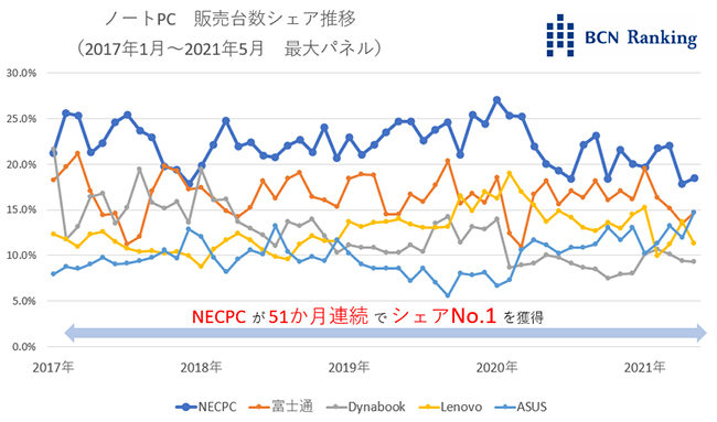 2020年4月に発生したテレワーク需要に伴うノートPC市場の好調は、1年が経過した21年春商戦でも健在だった。在宅勤務で快適に作業できるノートPCが欲しいというユーザーの意向が強まったものとみられる。また、子どものいる家庭であれば、オンライン学習の定着などで家族それぞれに専用のノートPCが必要になったことも買い増しを後押しした。市場が大きなトピックで盛り上がる中、PCメーカー各社は新しい様式に合わせた新製品の投入を行った。メーカーシェアの順位も目まぐるしく入れ替わりが発生したが、意外にも1位は年間を通して変わらなかった。トップを守り通したのは、NECパーソナルコンピュータ(以下、NECPC)だ。同社は、2017年2月から51か月連続で首位を獲得している。