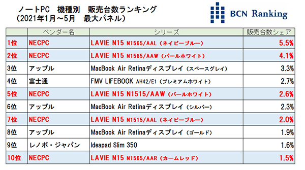 消費者の新しい期待を受けて、特に売れているのが、20年7月に発売したNECPCの15.6型ワイドノートPC「LAVIE N15シリーズ」だ。BCNランキングの21年1~5月における機種別販売台数ランキングでは、「LAVIE N15(N1565:ネイビーブルー)」「LAVIE N15(N1565:パールホワイト)」がワンツーフィニッシュを飾るなど、21年上半期を代表するノートPCとなっている。