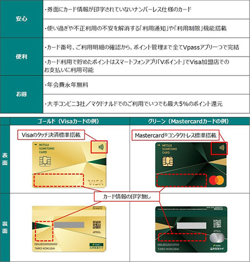 既存の「三井住友カード(NL)」と同じく、主要コンビニ3社とマクドナルドの利用で最大5%ポイント還元となる。加えて、ゴールドカードのみの特典として「年間100万円の利用で1万ポイント還元」「空港ラウンジサービス」「最高2000万円の海外・国内旅行傷害保険」「年間300万円までの買物安心保険」が付帯する。国際ブランドはVisa/Mastercard、カラーは2色から選ぶことができる。