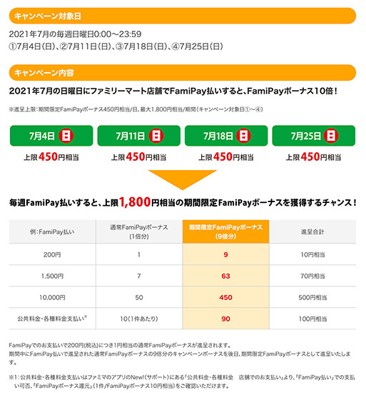 対象日は2021年7月4日・11日・18日・25日の計4日間。上限は1日につき450円・計1800円相当。商品(税込200円につき1円相当の通常FamiPayボーナス付与)に加え、公共料金・各種料金の支払い(1件あたり10円相当の通常FamiPayボーナス付与)も対象となる。