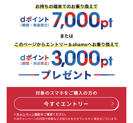 NTTドコモは、「ahamo」の契約でdポイント(期間・用途限定)を進呈する「お持ちの端末でのお乗り換えでdポイント7,000pt(期間・用途限定)還元キャンペーン」を開始した。終了時期は未定。1回線につき1回までとなる。