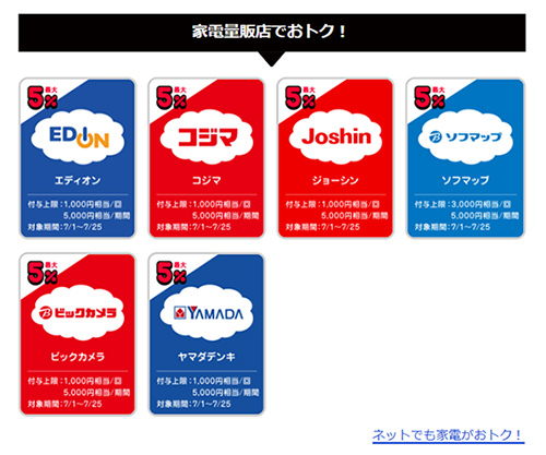 家電量販店は、エディオン、コジマ、ジョーシン、ソフマップ、ビックカメラ、ヤマダデンキと対象店舗が多い。還元上限は1000円相当/回、5000円相当(ソフマップのみ、3000円相当/回、5000円相当)。それぞれのオンラインショップも対象となるのがうれしいところだ。