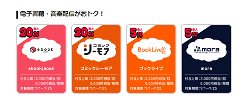 還元率の高さが魅力なのは、電子書籍。ebookjapanとコミックシーモアは最大20%還元ととりわけ高還元なので要チェックだ。還元上限は3000円相当/回、5000円相当/期間。