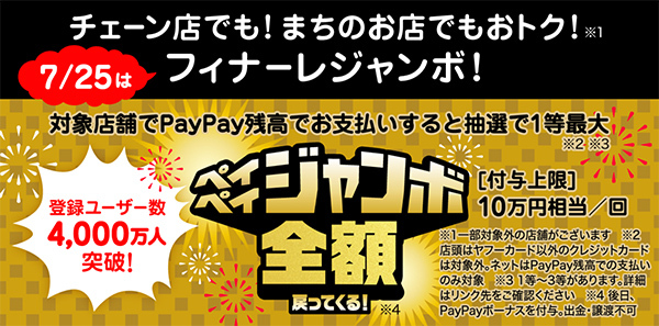 最終日には、目玉の「4,000万ユーザー突破記念!夏のPayPay祭フィナーレジャンボ」が開催される。こちらは、PayPayを使えるほとんどの実店舗とオンラインショップが対象。PayPayで支払うと、抽選で1等が決済金額の100%、2等が10%、3等が1%のPayPayボーナスを付与する。PayPayボーナスの付与上限は1回10万円相当。