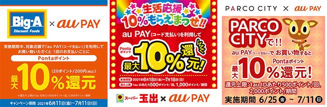 au PAYは、対象店舗を限定してお得なキャンペーンを実施中。6月11日~7月11日の期間でビッグ・エー、6月18日~7月18日の期間でスーパー出玉、6月25日~7月11日でPARCO CITYで10%還元する。還元上限は、いずれも1au ID当たり500ポイント/回、1000ポイント/期間。