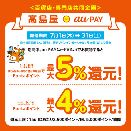 また、7月1日からは高島屋でもキャンペーンを開始。対象百貨店でPontaカードを提示の上でau PAY決済すると、Pontaポイントを最大5%付与、さらに対象専門店なら最大4%が上乗せされる。1au ID当たり2500ポイント/回、5000ポイント/期間。