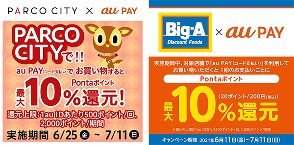 au PAYが対象店舗を限定して開催しているキャンペーンは間もなく終了するものがいくつかある。ビッグ・エーとPARCO CITYの10%還元は7月11日、スーパー出玉の10%還元は7月18日までとなっている。還元上限はいずれも1au IDあたり500ポイント/回、1000ポイント/期間。