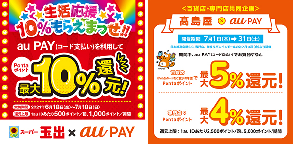 7月31日までじっくり使えるのは、高島屋のキャンペーン。対象百貨店でPontaカードを提示の上、au PAYで決済すると、Pontaポイントを最大5%付与、さらに対象専門店なら最大4%が上乗せされるというものだ。1au IDあたり2500ポイント/回、5000ポイント/期間。