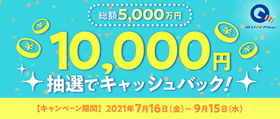 今回のキャンペーンでは、期間中にQUICPayで合計1万円以上利用すると、抽選で5000人に1万円をキャッシュバックする。