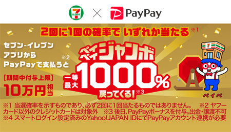 PayPayでは8月に開催されるキャンペーンも発表済み。7月26日に開始する「セブン-イレブンアプリキャンペーン第6弾 セブン-イレブンアプリで当たる!ペイペイジャンボ」は、セブン-イレブンアプリからのPayPay決済すると抽選で最大1000%を還元するというもの。還元上限は10万円相当/回・期間。期間は8月29日まで。