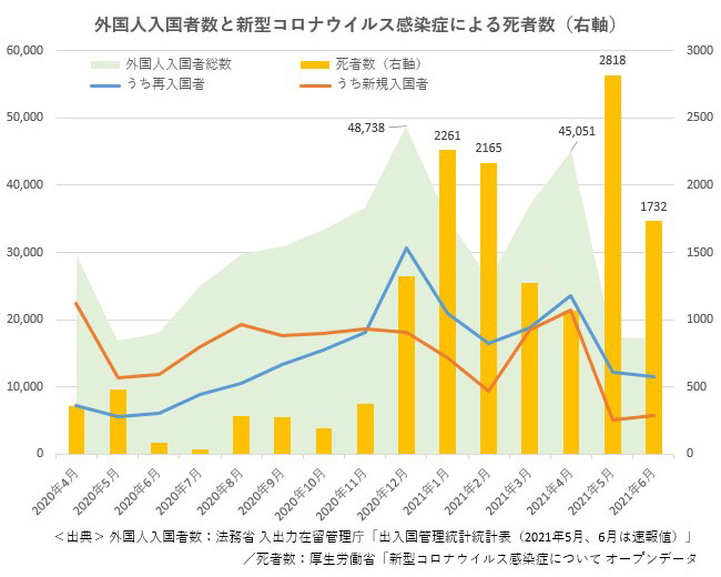 新型コロナウイルス感染症による死者数と、外国人の入国者数を比べると、何らかの相関があるように見える。わが国で入国制限を厳しくした昨年4月以降、外国人の入国者が最も多かったのは12月の4万8000人。次いでこの4月の4万5000人だった。死者数はこれら2つのピークに1カ月遅れて急増した。新型コロナウイルス感染症による国内の死者数は、実はこの5月が最も多く、2818人にのぼった。そこへオリンピックだ。海外から選手、役員、報道関係者など合わせて最大で9万人が来日するとみられる。つまり、外国人入国者は、12月と4月のピークのさらに倍の人数の入国が、7月から8月の入国者数に「加算」されるわけだ。現在日本は、159の国と地域からの上陸を拒否している状態。出場選手や関係者はあくまでも例外とされているが、基本は上陸拒否なのだ。
