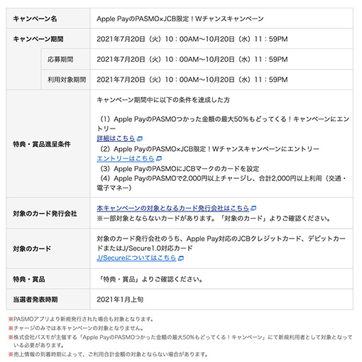 このキャンペーンにあわせてJCBは、エントリーの上、対象のJCBカードでApple PayのPASMOにチャージすると抽選で400人にPASMOチャージ1万円分をプレゼントする「Apple PayのPASMO×JCB限定!Wチャンスキャンペーン」を開始した。対象は「最大50%もどってくる!」キャンペーンにエントリーの上、キャッシュバックの条件を満たした人。