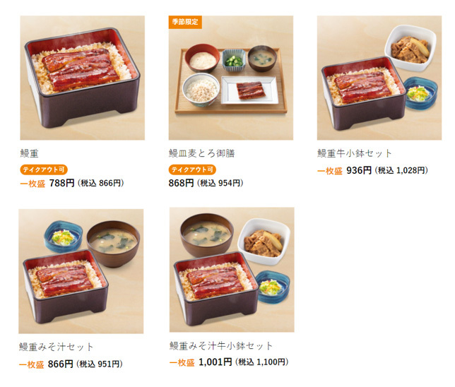 まず、吉野家は定番の「鰻重」(866円)のほか、鰻皿麦とろ御膳(954円)、鰻重牛小鉢セット(1028円)、鰻重みそ汁セット(951円)、鰻重みそ汁牛小鉢セット(1100円)をラインアップ。鰻重と鰻皿麦とろ御膳はテイクアウトにも対応しているので、自宅でもじっくり味わえる。