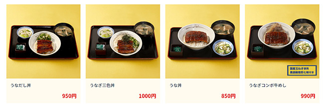 松屋は「うな丼」(単品:680円、みそ汁付:850円、ダブル:1390円)に+αのメニューも充実している。山形だしを追加した「うなだし丼」(950円、ダブルは1490円)、牛丼と融合した「うなぎコンボ牛めし」(990円、ダブル:1530円)、山形だし+とろろの「うなぎ三色丼」(1000円)など、いずれもスタミナがつきそうな組み合わせだ。
