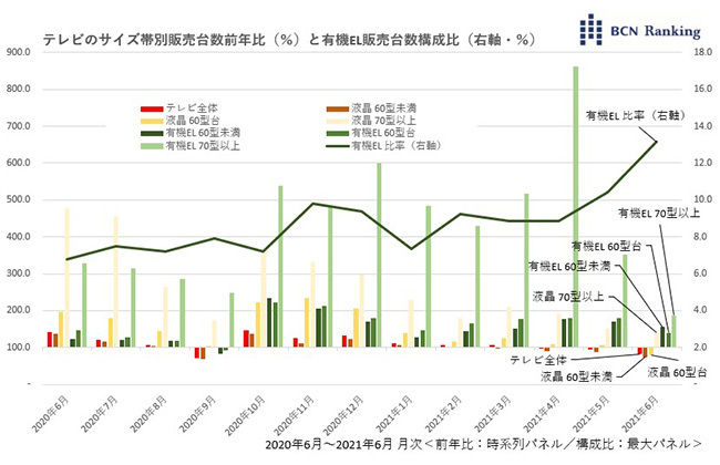 一口にテレビといっても画面サイズや液晶、有機ELといったパネルの違いによってバリエーションが豊富だ。全体でこそ前年割れだが、60型以上の大型テレビに限ると好調だ。6月の販売台数前年比で113.0%と依然2ケタ増。画面サイズ帯、パネル形式別に細分化してみると、液晶の70型以上と有機ELは2ケタ増の伸びを維持している。