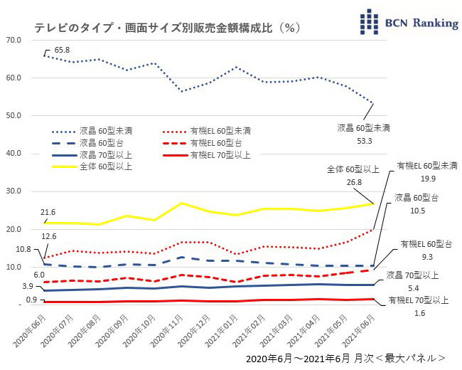 テレビの販売台数は6月、前年比で82.0%と2桁割れに終わった。コロナ禍1年目の昨年6月に140.9%と大幅増だった反動だ。昨年は巣ごもり需要が活発化した影響で多くのカテゴリーで販売が伸長した。テレビのその一つ。確かに前年比では2桁割れだが、コロナ禍の影響のない一昨年との比較「前々年比」では115.6%。テレビ市場は、ある程度の活況を維持していると見ていいだろう。オリンピックの効果もある程度は出ていると思われるが、例年とは異なるコロナ禍による影響が大きく、オリンピック単独での影響は見えにくくなっている。