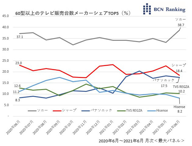 活況を示す60型以上のテレビ市場でメーカー別シェアを見ると、最も強いのがソニーだ。この6月では38.7%と過去1年で最も高いシェアを獲得している。次いでシャープが18.4%、パナソニックが17.5%で追いかける。TVS REGZAが10.2%、Hisenceが8.2%と続く。この1年でシェアを伸ばしたのがパナソニック。昨年6月の8.3%から倍増させた。同社はオリンピックの最高位のスポンサー「ワールドワイドパートナー」。昨年は開催1年延期の影響をダイレクトに受けた。開催にこぎつけた今年、シェアを挽回しつつある。
