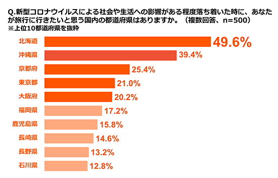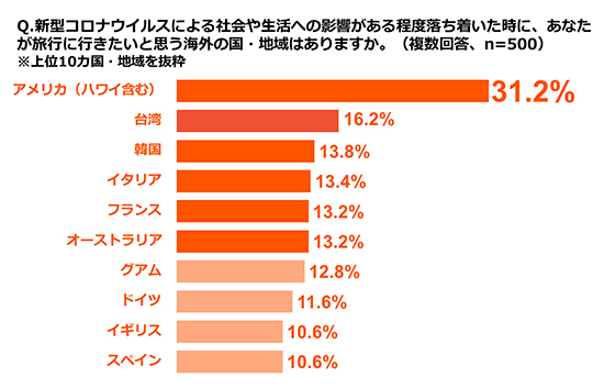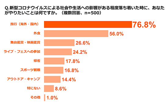 調査結果によれば、新型コロナウイルス感染症が落ち着いたらやりたいこととしては、「海外・国内旅行」が1位、「外食」が2位、「舞台鑑賞・映画鑑賞」が3位についた。