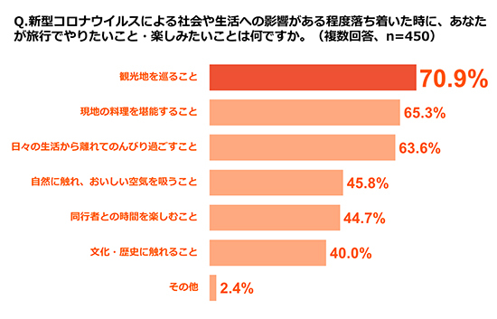 海外・国内旅行でやりたいことや楽しみにしていることを尋ねた質問では、「観光地をめぐること」や「現地の料理を堪能すること」が上位を占める中で、「自然に触れ、おいしい空気を吸うこと」が4位にランクインした。